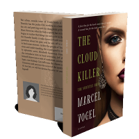 “Close-up of a woman's face with dramatic makeup and earrings on a book cover with a dark, mysterious theme.”
