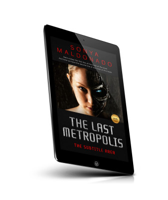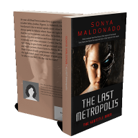 “A woman's face is merging with a robotic half, with a dark background. The book title is "The Last Metropolis".”