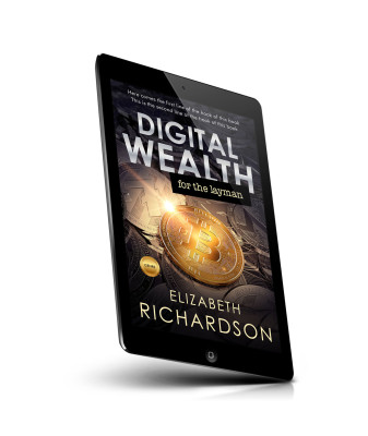 “A digital-themed book cover featuring coins with cryptocurrency symbols.”