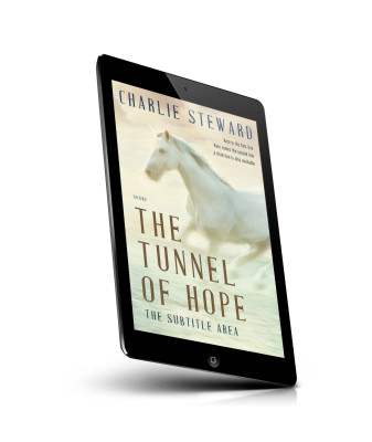 “A white horse running across a blurry, light-toned background. Large text overlay dominates the lower half of the image.”
