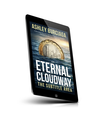 “A 1 euro coin above water is set against a serene sunset, with bold text overlay for a book titled "Eternal Cloudway".”