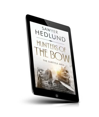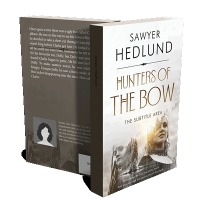 “Two women, forest imagery, and mountains blend with the sky on a book cover. Title: "Hunters of the Bow" by Sawyer Hedlund.”