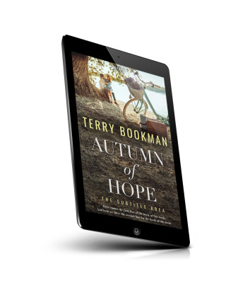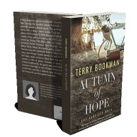 “A couple sits by a lake, near a green bicycle and a picnic basket under a tree. The cover text predominantly features the title "Autumn of Hope."”
