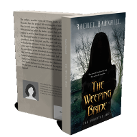 “Silhouette of a woman in front of a dark, eerie house with overcast skies.”