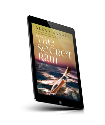 “A sealed glass bottle with a message floats on the ocean at sunset, with a title and author's name presented above.”