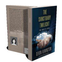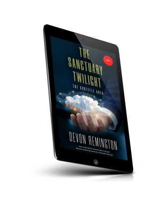 “A hand holds a cloud with connected nodes, against a dark background. The text is about a book titled "The Sanctuary Twilight" by Devon Remington.”