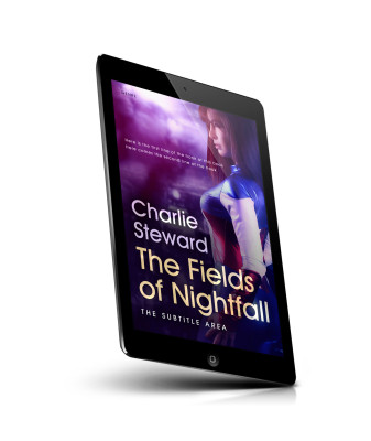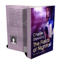 “A woman in a futuristic outfit stands with a cityscape in the background. Cover of a book titled "The Fields of Nightfall" by Charlie Steward.”