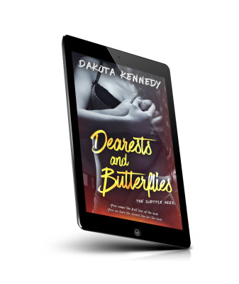 “A black-and-white photo of a couple embracing, with the title "Dearest and Butterflies" in bold yellow letters.”