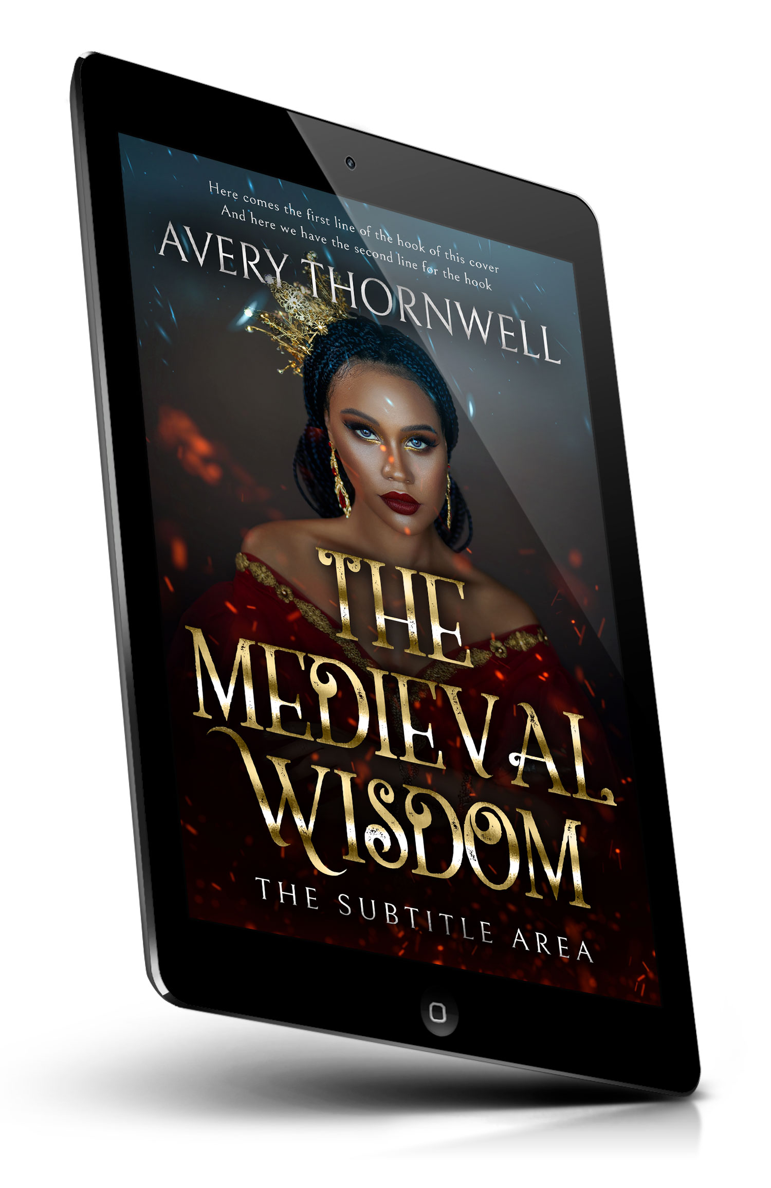 “Regal woman with braided hair and a gold crown, wearing a red gown, framed by drifting sparks on a dark backdrop.”