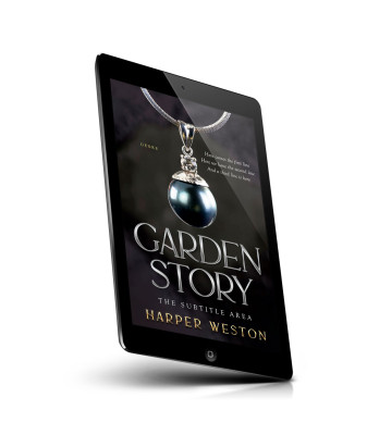 “A pendant with a dark pearl on a chain is centered above the title "Garden Story" on a dark background.”
