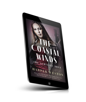 “A woman holding a gun with a serious expression is on the cover of "The Coastal Winds." The overall tone is dark and mysterious.”