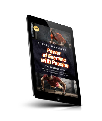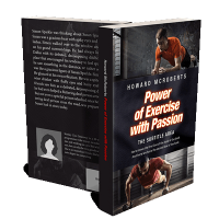 “A book cover showing two men doing push-ups, with the title "Power of Exercise with Passion" by Howard McRoberts.”