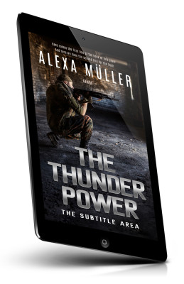 “A figure in camo kneels with a rifle in a dimly lit, abandoned building. The title "The Thunder Power" is prominently displayed.”