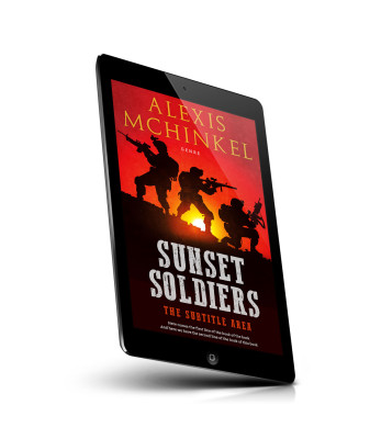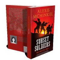 “Three soldiers with weapons are silhouetted against a sunset, with bold text below them.”