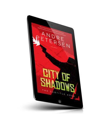 “Silhouette of a person aiming a gun on a red background with green city-like text at the bottom.”