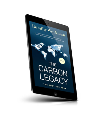 “Icebergs floating in an ocean with a dark blue background, featuring large text "The Carbon Legacy" in the center.”