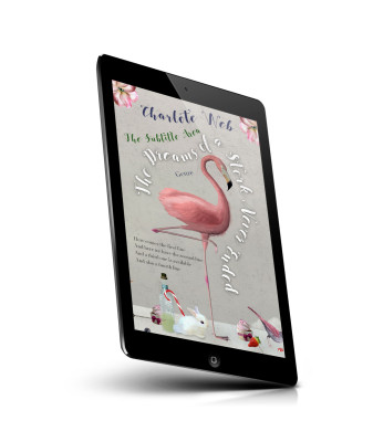“A pink flamingo stands on one leg amidst a whimsical scene with a rabbit, strawberries, a bottle, and subtle floral accents.”
