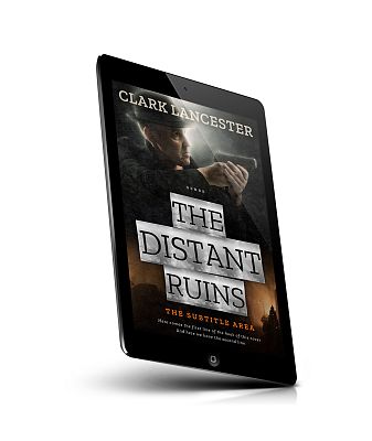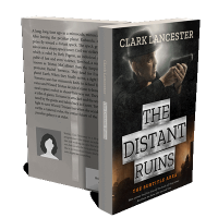 “A man, dressed in dark clothing, aims a gun. Smoke and ruins are in the background. The title "The Distant Ruins" is prominently displayed.”