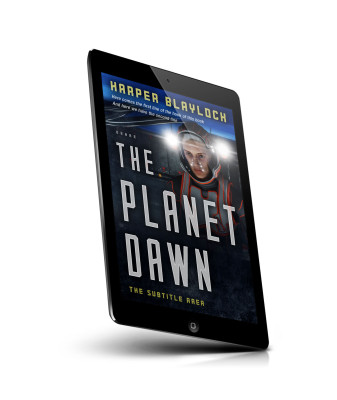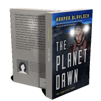 “A sci-fi book cover featuring a person in futuristic gear with a glowing helmet, titled "The Planet Dawn" by Harper Blaylock.”