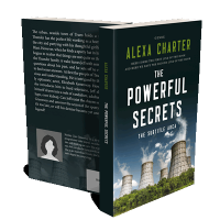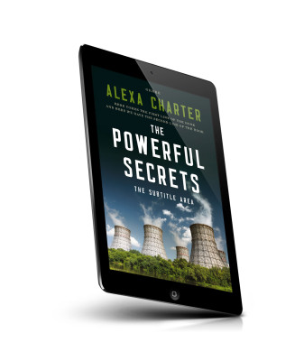 “A book cover featuring cooling towers of a power plant against a cloudy sky with a green and black gradient background.”