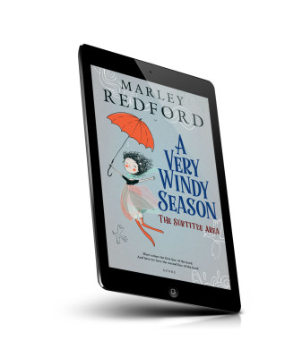 “A girl with curly hair floats with a red umbrella against a windy backdrop, with birds flying around.”