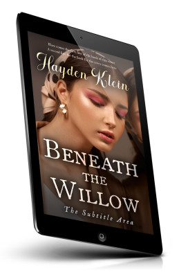“A woman with pink eyeshadow and reflective background, on a book cover titled "Beneath the Willow." ”