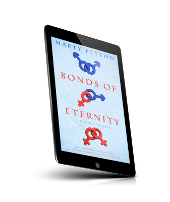 “Book cover with intertwined gender symbols and the title "Bonds of Eternity" on a textured light blue background.”