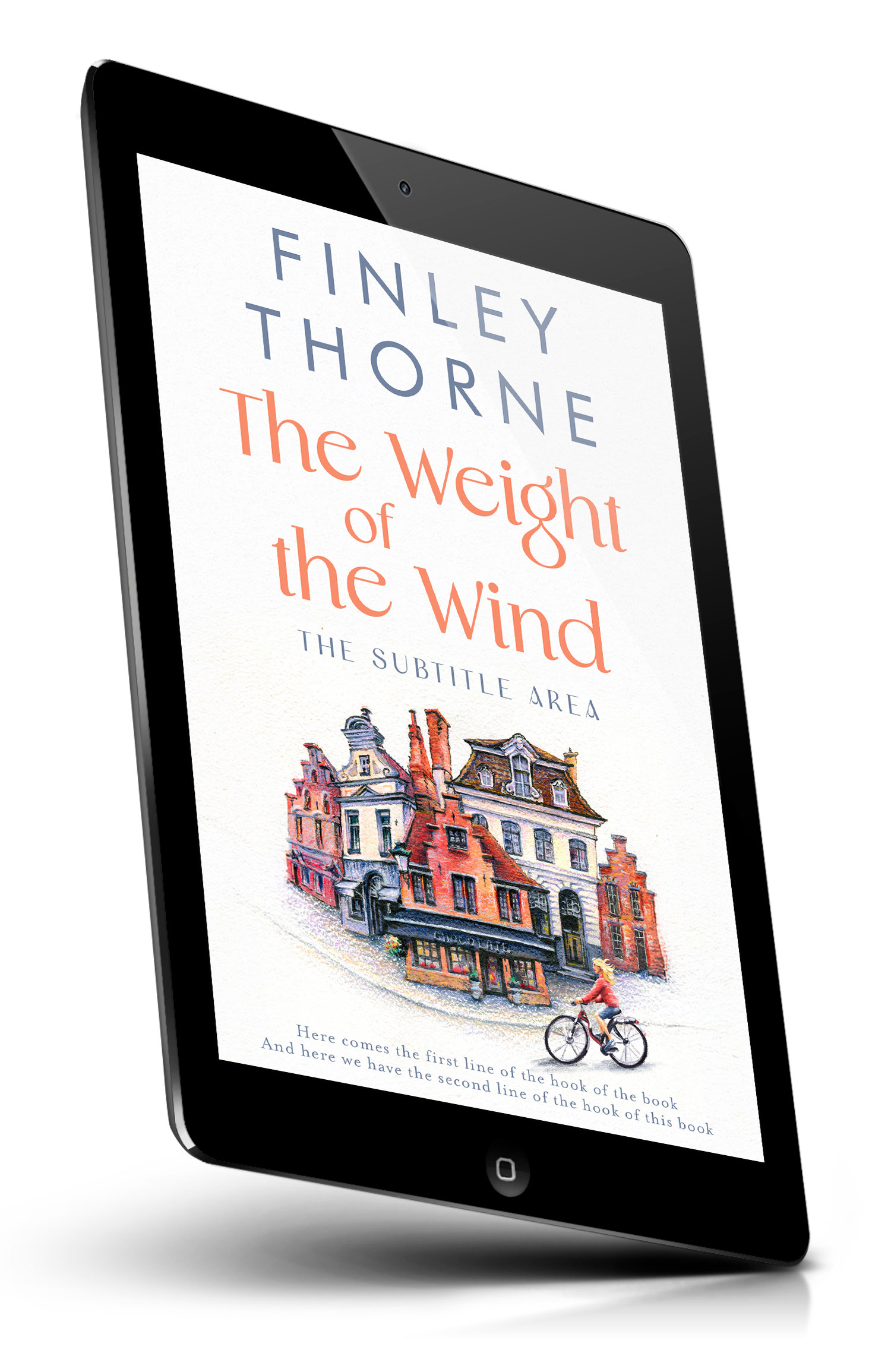 “Watercolor-style book cover showing quaint European buildings and a person riding a bicycle along a street.”