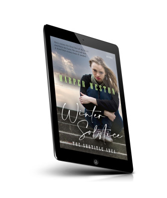“A pensive woman sits on outdoor steps, leaning forward with arms wrapped around her knees on a book cover titled "Winter Solstice."”