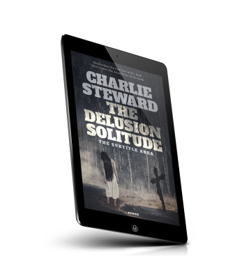 “A lone figure with long dark hair stands in a foggy forest near a cross, underneath the book title "The Delusion Solitude."”