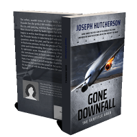 “An airplane is on fire in mid-air, diving toward the ground with a turbulent sky in the background.”