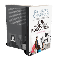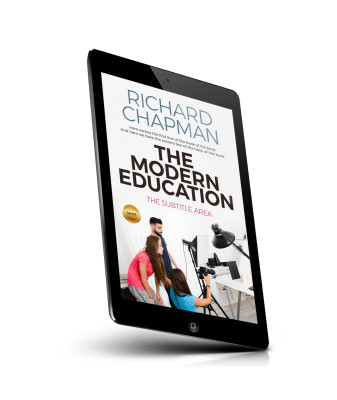 “Three people adjusting a camera and lighting setup in a studio environment. Book title: "The Modern Education" by Richard Chapman.”