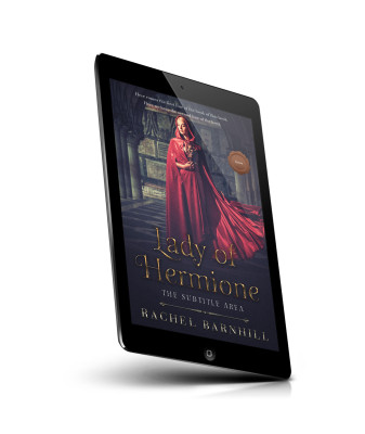 “A woman in a red cloak stands in a grand hall, holding a staff. The image has a medieval fantasy theme.”