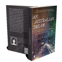 “A busy city street at night with bright lights and traffic, overlaid with a book title and author's name.”