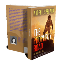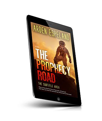 “An astronaut stands on a rocky terrain with a dramatic sunset, words "The Prophecy Road" in bold letters.”