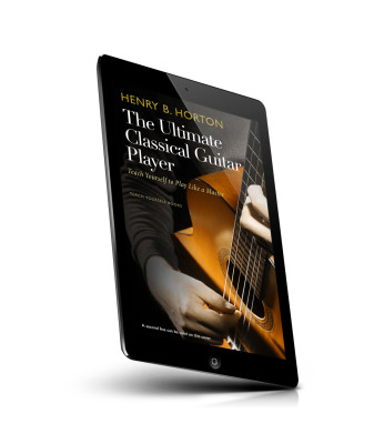 “A person playing an acoustic guitar, with a book cover title about becoming a classical guitar player.”