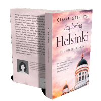 “A book cover showing a domed building under a pastel-colored sky, with the title "Exploring Helsinki" in prominent lettering.”