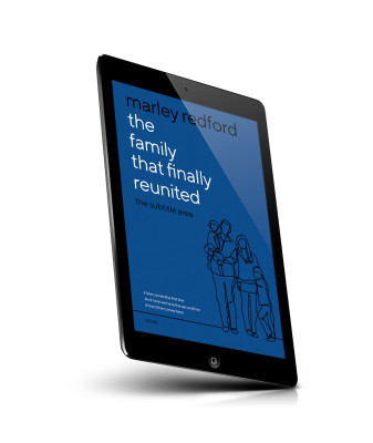 “A book cover with a minimalist drawing of a family of four on a blue background.”