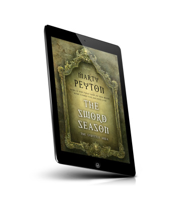“An ornate, vintage frame with decorative design, featuring a mystical book cover titled "The Sword Season" by Marty Peyton.”