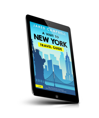 “Illustration of New York City with the Statue of Liberty and skyscrapers, featuring bold text about a travel guide.”