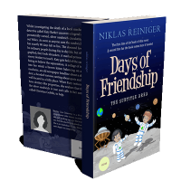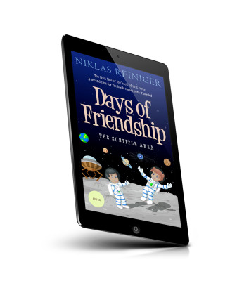 “Two astronauts, a boy and a girl, stand on the moon with planets and stars in the backdrop. The book title is prominently displayed above.”