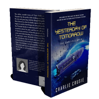 “A spaceship floats in space against a starry background, beneath a futuristic title.”