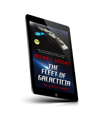 “A spaceship in space with a book title and author's name prominently displayed.”