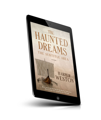 “A book cover for "The Haunted Dreams" features a ship illustration and an author's name, Harper Weston.”