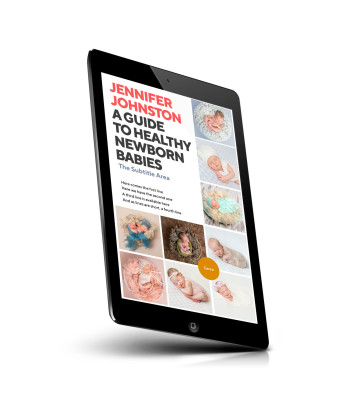“A cover features photos of newborns in various poses and cozy settings, surrounding text about a guide to healthy newborn babies.”
