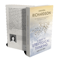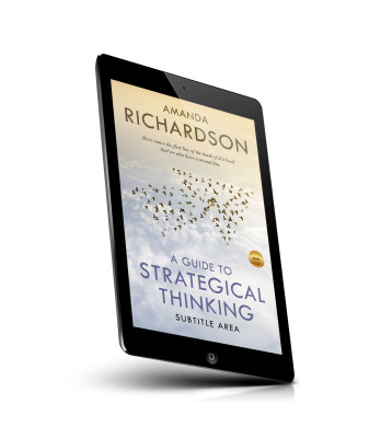 “Flock of birds in flight against a clouded sky, with text about strategic thinking and an author's name.”