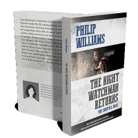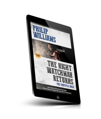 “A man points a handgun with a serious expression, part of a dramatic book cover design.”