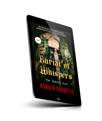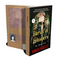 “A hand grips a sword hilt with ornate green and gold fabric in the background. The title "Burial of Whispers" is in bold, gothic font.”