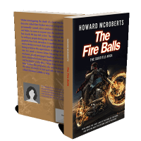 “A motorcyclist in a plaid shirt rides a fiery, speeding bike, creating sparks against a dark background.”