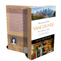 “A book cover featuring Vancouver's skyline with autumn leaves and totem poles in a park setting.”